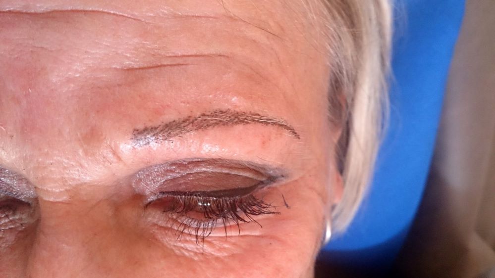 FRISCHE Härchenzeichnung an der Augenbraue, daher ist die Farbe noch etwas dunkler